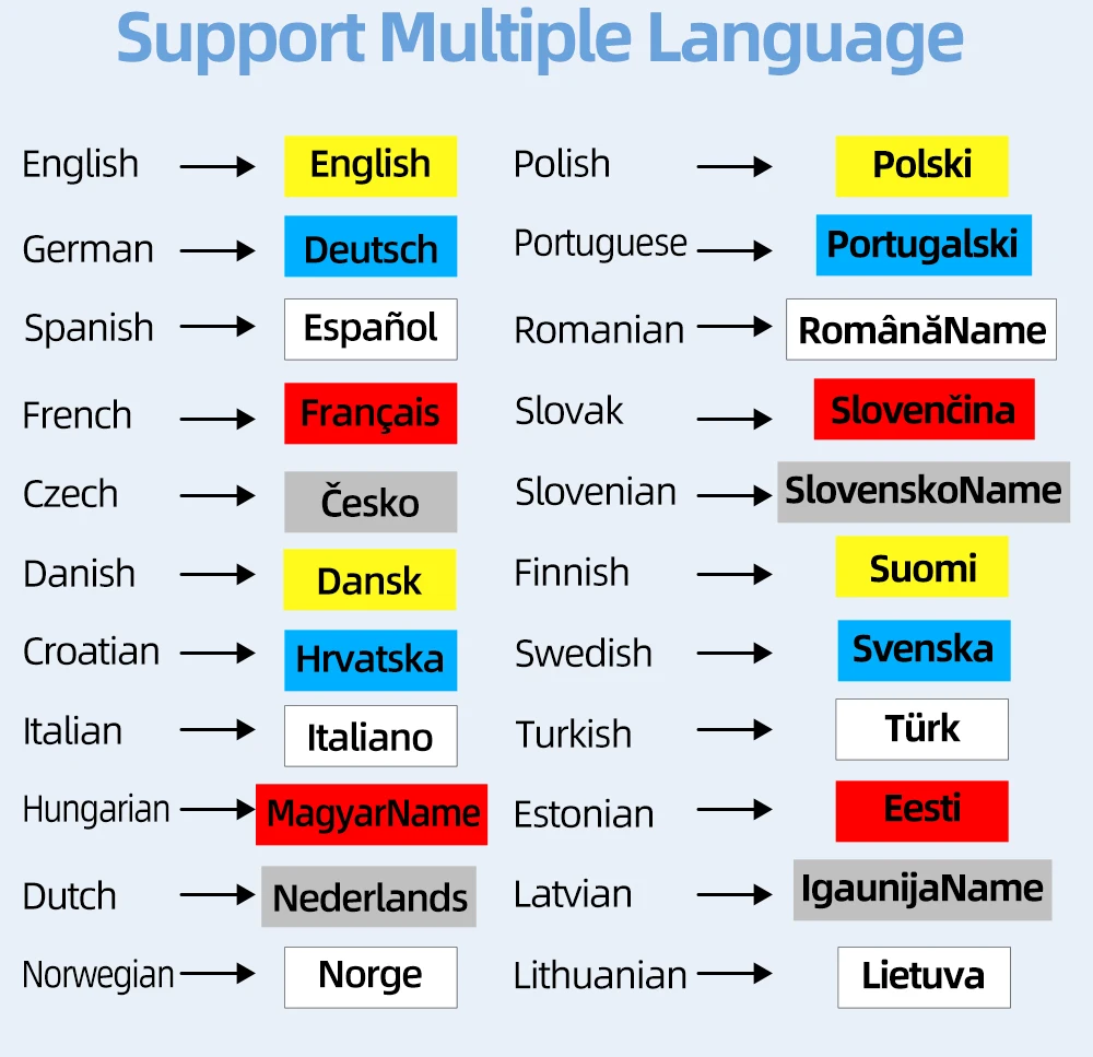 Czech, Danish, German, English, Spanish, French, Croatian, Italian, Hungarian, Dutch, Norwegian, Polish, Portuguese, Romanian, Slovak, Slovenian, Finnish, Swedish, Turkish, Estonian, Latvian, Lithuanian